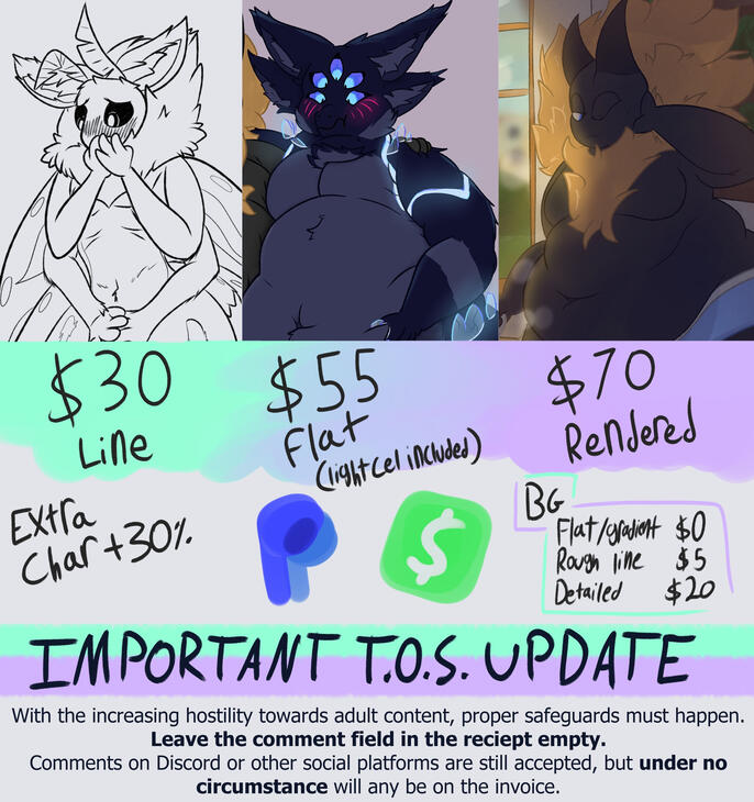 If you would like alt's (alternate images) of your commission, understand that there will be additional fees depending on the complexity and the amount requested. This includes textless, clothed/unclothed, anatomical changes, etc.